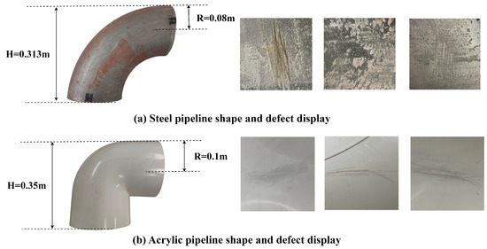 The geometric specifications and defect characteristics of the two pipeline types are depicted in Figure 7. Figure 7a presents the steel pipeline, which was sourced from a decommissioned industrial system and contained naturally occurring defects such as rust patches, surface scratches, and pitting corrosion. In contrast, Figure 7b displays the acrylic pipe, on which scratches were artificially created to simulate common damage, given its material properties. In this experiment, we used the detection rate () metric to evaluate the performance of the ES-YOLO framework. The detection rate was defined as the ratio of the number of defect samples successfully detected by the framework to the total number of defect samples captured by the camera, as expressed in Equation (8).