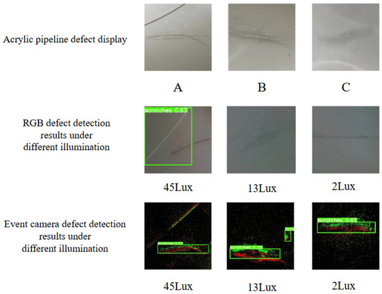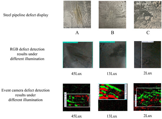 Comparison experiment of different defects and illumination levels in steel pipes. Among them, A, B, and C represent the target defects in the steel pipe. Both the event camera and RGB camera can detect the defect at all three points (A, B, and C), where the illumination levels are 45 Lux, 13 Lux, and 2 Lux, respectively.