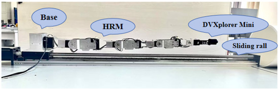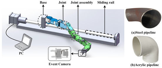Experimental platform for pipeline defect detection based on an event camera. The setup comprises the key components of the system, including a HRM, a movable base, a sliding rail, an event-based camera, and the pipeline specimen under inspection.