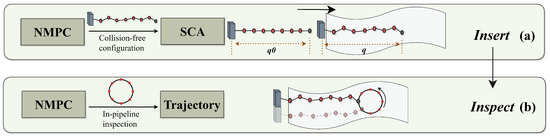 Ref. [12] proposed a pipeline inspection and detection method that integrates Nonlinear Model Predictive Control (NMPC) with a Snake-inspired Heuristic Crawling Algorithm (SCA). The method is divided into three stages: insertion, inspection, and exit. During the insertion and withdrawal stages, the SCA—inspired by snake locomotion—is employed to significantly reduce path planning time. In the inspection stage, NMPC is applied to ensure efficient and collision-free configuration. Specifically, NMPC functions as a high-level planner, generating a global, collision-free path configuration. In contrast, SCA operates as a low-level controller, guiding the manipulator to accurately track the sequence of path points generated by NMPC, thereby executing the physical insertion motion.