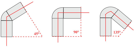 Schematic diagram of single-bend pipe models with different curvatures, where the red solid line represents the pipeline centerline.