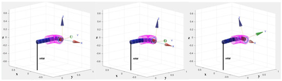 The optimization objective of this pose planning is to minimize the sum of the absolute values of the joint angles and the sum of the changes in joint angles between adjacent configurations. This objective helps prevent the HRM from moving to its joint limits and avoids abrupt movements caused by local minima. The planning method for the collision-free configuration of the i-th target point is shown in Equation (11), where represents the j-th joint angle () of the i-th configuration; is the desired pose vector of the i-th target point; , define the upper and lower limits of the HRM’s joint angles; and represents the minimum safe distance between the HRM and the pipeline.