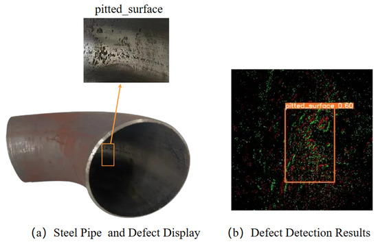 Steel pipe internal defect detection. (a) shows the shape and defects of the steel pipe; (b) shows the detection results of the steel pipe.