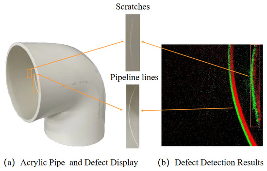 Acrylic pipe internal defect detection. (a) shows the structure and defects of the acrylic pipe; (b) shows the detection results of the acrylic pipe defects.