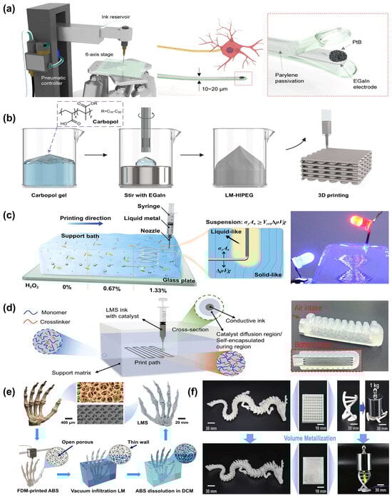 Currently, DIW-based 3D printing is progressively evolving from planar to three-dimensional structures, from rigid to flexible substrates, and from single-function components to multifunctional systems. Continuous innovation in structural materials, printable inks, fabrication strategies, and application scenarios is driving the development of wearable electronics, neural interfaces, and flexible energy systems toward greater precision, integration, and intelligence. As shown in Figure 3b, Lin et al. developed a high internal phase emulsion gel ink using a Carbopol hydrogel matrix, enabling 3D printing via DIW. The specific interaction between Carbopol and the surface oxide layer of the LM allows for stable dispersion of LM droplets at a high volume fraction (82.5%), resulting in a structurally robust emulsion gel. During the printing process, the hydrogel acts as a lubricant, reducing inter-droplet friction and preventing rupture of the oxide layer, thereby enhancing the printability of high-resolution, self-supporting LM structures. Additionally, the polyelectrolyte nature of Carbopol supports electrocapillarity, enabling rapid activation of electrical conductivity at low voltages and endowing the printed architectures with excellent electrical performance [47].