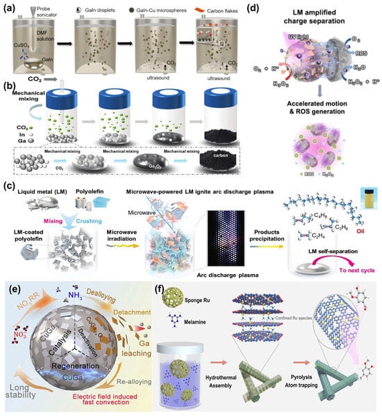 Illustrative diagram of the representative LM catalysis. (a): Fabrication of GaIn-Cu composite catalysts through ultrasonic-assisted methods, and CO2 conversion facilitated via prepared GaIn-Cu composite catalyst [87]. (b): The conversion of carbon dioxide into solid carbon using LMs [35]. (c): The working principle of microwave-powered LM depolymerization for polyolefin plastic upcycling [88]; (d): The LM-based photocatalytic MNMs for antibacterial therapy [89]; (e): The CuGa2-LM electrode for the electro chemical nitrate reduction [90]; (f): The synthesis and characterization of hollow Ru1@m-tube [91].