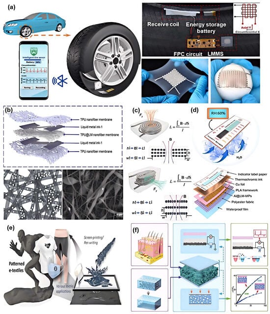 Schematic representation of typical LM-based sensors. Mechanical sensor: (a): The working mechanism and structure of LMSCS for smart tire strain monitoring with its applications [108]; (b): TPU@LM sensor with its fiber dielectric layer and SEM image [110]; (c): Anisotropic sensing capabilities of AI-LMS [111]; Chemical sensor: (d): LM microparticle enabled humidity sensor [112]; Multimodal sensor: (e): Synthetic roadmap to convert bulk LM to SeLM-SeCNT nanodroplets and the fabrication of water-based SeLM-SeCNT conductive [113]; (f): The multifunctional flexible sensor [114].