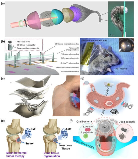 The fields of flexible electronics and soft robotics have also benefited from the unique properties of LMs. By integrating LMs into elastic matrices, highly stretchable and compliant electronic devices and robotic components can be fabricated, enabling innovative applications in health monitoring, human–machine interaction, and medical exploration [36,37]. Additionally, remarkable progress has been made in the application of LMs in the biomedical field, ranging from neural signal monitoring to visual function restoration, tumor treatment, and systemic disease intervention [38,39,40]. LMs are gradually emerging as a key material for next-generation bioelectronics and intelligent therapeutic systems.