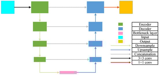 U-Net [25] is a widely used convolutional neural network architecture for image segmentation, characterized by its symmetric U-shaped design. This structure integrates an encoder (downsampling path), a bottleneck, and a decoder (upsampling path), and connects feature maps from corresponding encoder and decoder layers via skip connections, as illustrated in Figure 1.