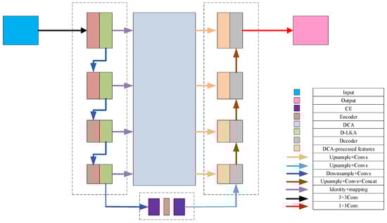 where denotes the encoder and bottleneck layers: for n = 1 to 4, it refers to the encoder layers, and for n = 5, it represents the bottleneck layer. denotes the decoder layers; represents the Context Extraction module; stands for the Deformable Large Kernel Attention mechanism; and denotes the Dual Cross Attention mechanism.