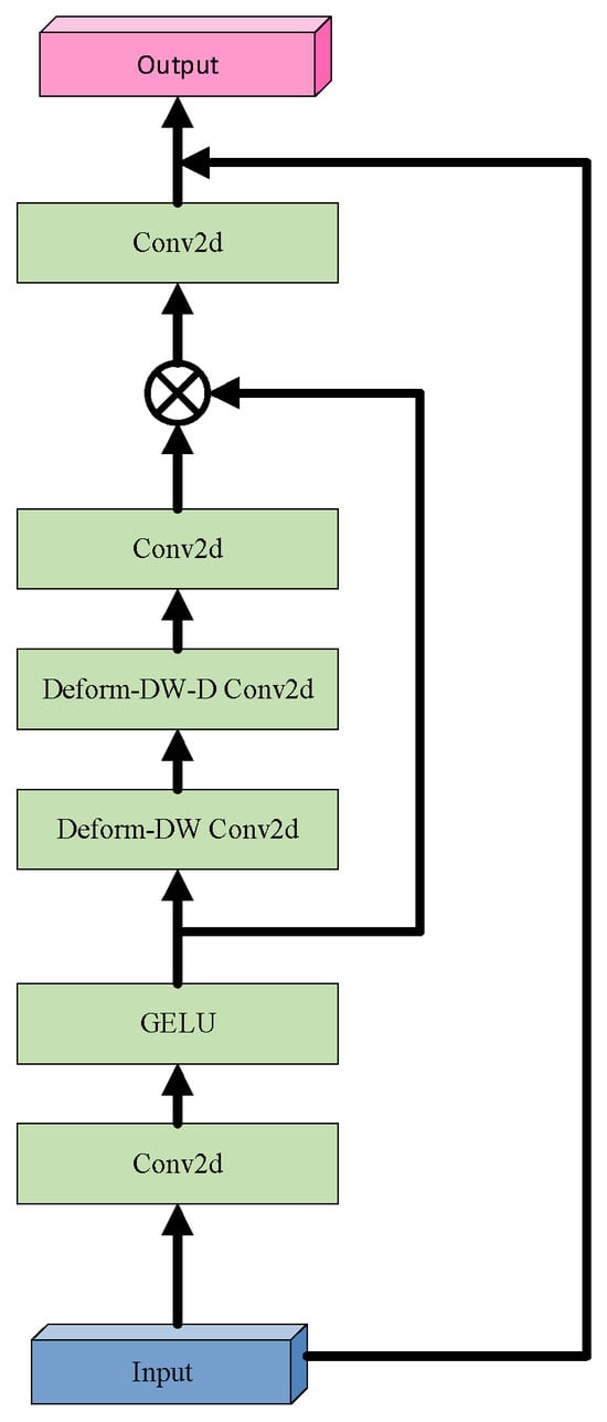 where denotes the input feature; GELU(x) represents the GELU activation function; refers to a 2D convolution; indicates a deformable depthwise convolution; denotes a deformable depthwise dilated convolution; and corresponds to the attention map, where each value reflects the relative importance of the associated feature. The operator represents element-wise multiplication.