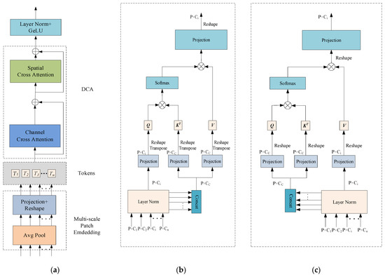 where is a scaling factor. In the multi-head setting, , where denotes the number of heads. The output of the SCA is refined using depthwise separable convolution to produce the final feature representation of the DCA mechanism. After layer normalization and GeLU activation, the n output tokens of the module are upsampled and connected to the corresponding layers in the decoder.