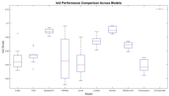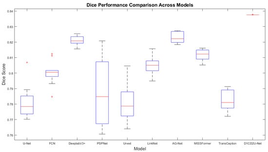 Comparison across different examples reveals some variability in model performance. In Examples 2 and 3, methods such as U-Net and AG-Net also achieved relatively high Dice scores, but they showed pronounced instability in other examples. In contrast, D1CD2U-Net maintained more consistent performance. Notably, in Example 4, conventional deep networks often yielded Dice and IoU values close to zero, reflecting difficulties in segmenting low-contrast or boundary-ambiguous regions, whereas D1CD2U-Net retained high accuracy, demonstrating strong generalization across samples. Nonetheless, Example 6 still exhibited boundary blurring and substantial negative errors, indicating limitations in small-volume lesions or low signal-to-noise scenarios.