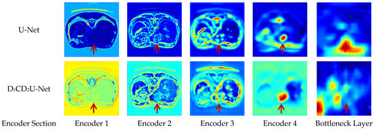 Finally, the features processed by the dual attention mechanism are organically fused with the global information extracted from the bottleneck layer, resulting in a more comprehensive and semantically rich feature representation. These features are then fed into the decoder, providing a strong foundation for the subsequent image reconstruction process. During decoding, the tumor’s fine structures are gradually restored through layer-wise upsampling and feature fusion, ultimately achieving accurate image segmentation. The entire framework, through these carefully designed components, enables efficient and precise processing of liver tumor images. The feature transmission process of the model is formulated as shown in Equation (4):