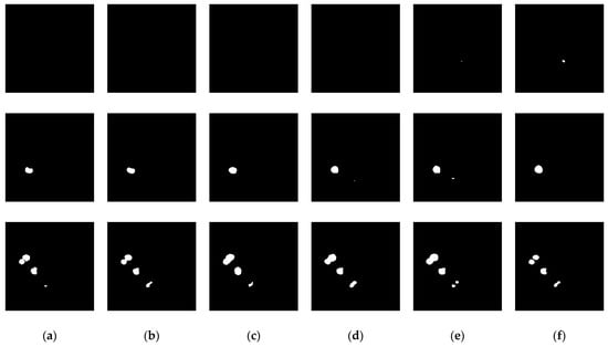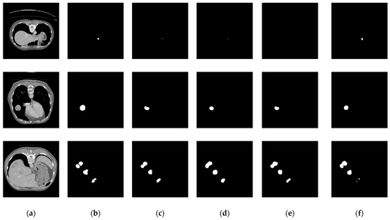 To evaluate the generalization capability of the models, the 3D-IRCADb01 dataset was employed as an independent external test set, enabling a comprehensive assessment of each model’s performance on previously unseen data. This section presents a comparison of the segmentation results on the 3D-IRCADb01 dataset, further demonstrating the superior performance of the proposed D1CD2U-Net model. Similarly to the internal test set, in Figure 16, panel (a) displays the original liver tumor image, (b) shows the ground truth annotation, while panels (c) through (f) present the segmentation results obtained by U-Net, FCN, LinkNet, and Unext, respectively. Figure 17 illustrates the segmentation results of AG-Net, DeeplabV3+, PSPNet, MISSFormer, and TransCeption in panels (a) through (e), with panel (f) showing the result produced by the proposed D1CD2U-Net model. The detailed segmentation results are presented in Figure 16 and Figure 17. The original images in Figure 16, from top to bottom, correspond to Example 4, Example 5, and Example 6, respectively.