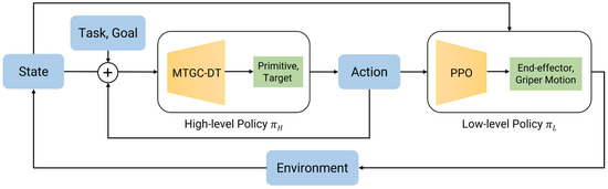 At the same time, this paper implements the low-level policy as a library of parameterized action primitives. These primitives are basic skills that are either predefined or learned offline, and each can directly execute a basic motion. The high-level Decision Transformer outputs discrete macro-action commands, which the low-level controller interprets and executes using the appropriate primitives. This restricts the high-level’s exploration to a finite set of semantic skills, rather than a continuous action space, greatly improving learning efficiency. Moreover, because the low-level primitives are task-agnostic and reusable, the framework can easily adapt to new tasks [15,16].