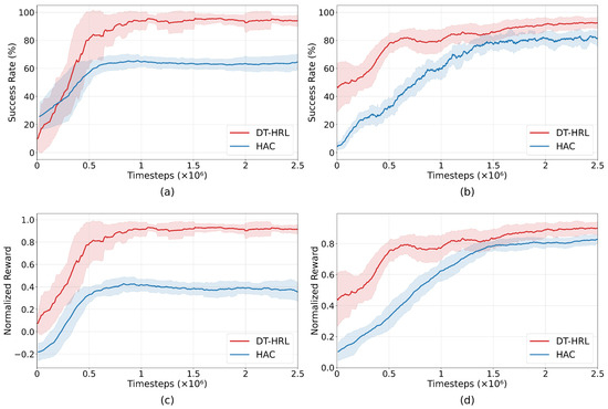 The training curves in Figure 5 present a direct comparison between DT-HRL and HAC baseline on both the stacking and sorting tasks. For visual clarity, curves are uniformly smoothed. The shaded region represents the corresponding moving window range. In both environments, DT-HRL achieves a higher success rate and greater normalized reward than HAC throughout the entire training process.