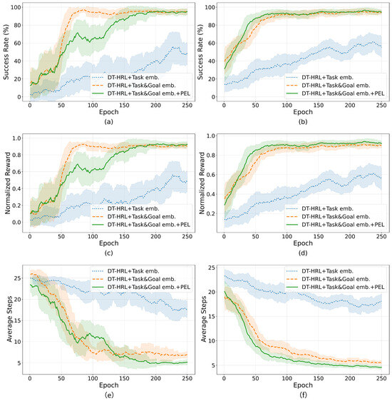 While the introduction of PEL does not further increase the task success rate markedly, it significantly reduces the number of steps required to complete the task. This improvement is directly reflected in Figure 6e,f. The (1) DT-HRL + Task emb. variant requires 15–20 steps on average, while adding goal embedding brings this down to approximately 7 steps. With PEL, the average steps further decrease to around 5 steps. This reduction in episode length reflects fewer unnecessary steps and more efficient task execution.