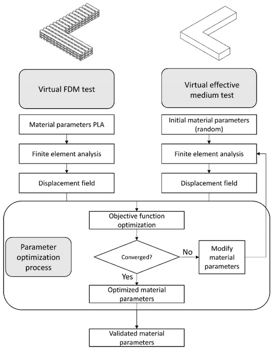A virtual test was developed using the finite element method (FEM), employing an L-shaped beam that integrates critical geometric parameters from the design region, including pore size, layer height, and porosity. From this model, characteristic displacement fields are obtained. Subsequently, a second virtual test is performed using a fully solid L-shaped beam. Through the application of multi-objective optimization techniques, the properties of the solid model are iteratively adjusted until convergence with the displacement fields of the initial model is achieved, enabling the determination of the effective mechanical properties. Finally, the obtained results are validated through homogenization techniques, allowing for a comparative analysis and verification of the effective properties in relation to the microstructural characteristics of the fabricated components. The entire process is illustrated in Figure 1.