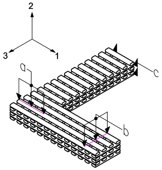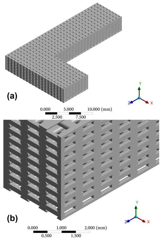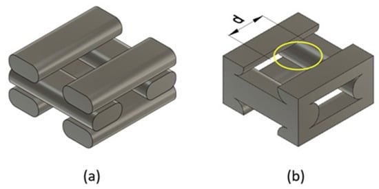 One of the most critical parameters in the FDM technique is the infill pattern. In this work, a rectilinear filament pattern (0°/90°) was selected, as it promotes pore interconnectivity. Although alternative geometries such as gyroid or triangular patterns have demonstrated greater mechanical efficiency and improved pore interconnectivity [4,5,6], a rectilinear (0°/90°) pattern was employed in this study due to its simplicity, ease of parametric control, and frequent use in FDM printing applications. This pattern enables a clear definition of orthotropic axes, which is essential for the validation of the proposed constitutive model. Additionally, the rectilinear configuration ensures consistent filament deposition and a predictable structure, allowing for reproducible simulation and homogenization analyses. Figure 2a illustrates this pattern, while Figure 2b shows the associated unit cell.