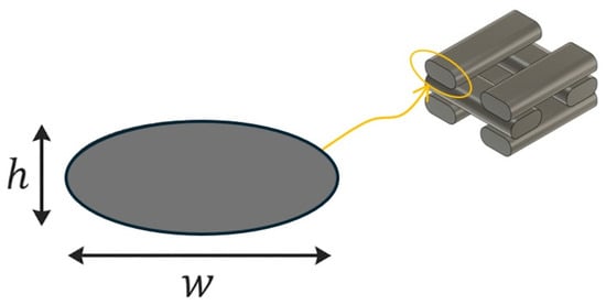 The fused deposition modeling (FDM) process results in an ellipsoidal cross-sectional geometry of the extruded filaments, as previously reported by other authors [36]. Figure 3 provides a schematic illustration of the filament cross-section, depicting a simplified ellipsoidal profile. The dimensions w and h represent the filament width and layer height, respectively. This geometric approximation is considered in the porosity calculation to account for the actual deposition morphology.