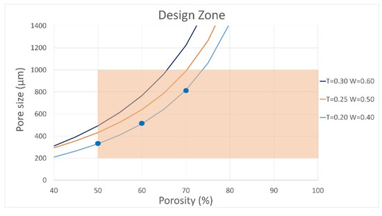Following the selection of the printing geometry, an admissible design space was defined to evaluate representative combinations of pore size and porosity, ensuring both biological relevance and manufacturability. Figure 4 shows this design space, with porosity on the x-axis and pore size on the y-axis. The three curves correspond to filaments printed with nozzle diameters (W) of 0.4, 0.5, and 0.6 mm, and layer heights (T) of 0.20, 0.25, and 0.30 mm, calculated based on filament spacing under different printing conditions. Biological constraints were established from previous studies recommending a porosity greater than 50% [11,39] and pore sizes between 200 µm and 1 mm, optimal for bone regeneration [40,41]. Within these limits, the admissible zone (depicted in orange) ensures compliance with both biological requirements and FDM manufacturing constraints.