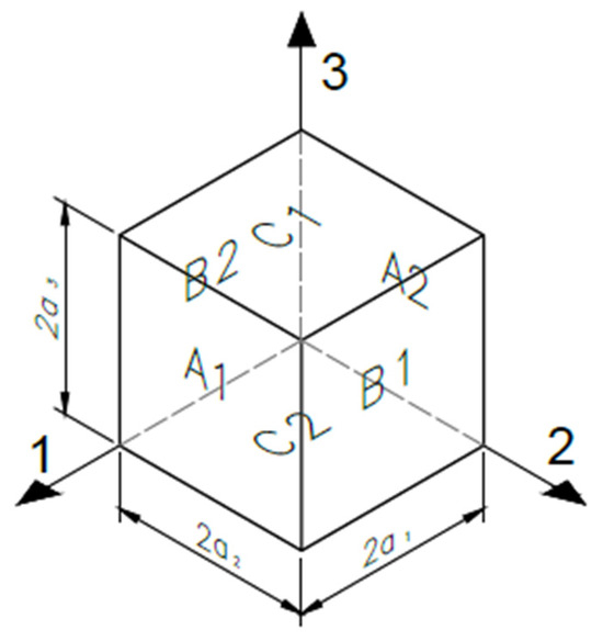 In this work, the homogenization procedure was fully implemented using the Material Designer module of ANSYS® (2023) [33], which automates the steps of geometry definition, mesh generation, material assignment, application of periodic boundary conditions, and mechanical analysis. Unlike asymptotic-based homogenization theories, this tool adopts a purely computational approach, relying on periodic boundary conditions and stress-strain averaging over a representative volume element, without requiring explicit analytical developments. The scaffold was modeled as a periodic medium in the three spatial directions, with the unit cell defined by parameters such as porosity, pore size, and layer height [39]. The PLA material was considered isotropic at the filament scale, while anisotropy at the scaffold level results from the internal architecture and printing pattern. The module outputs the homogenized orthotropic elastic constants derived from the unit cell’s response under six independent load cases. The unit cell configuration and its boundary surfaces are illustrated in Figure 5.