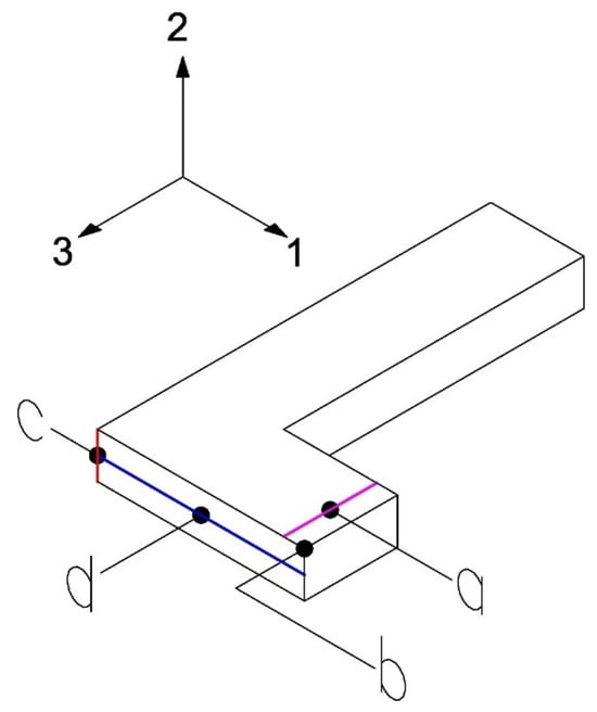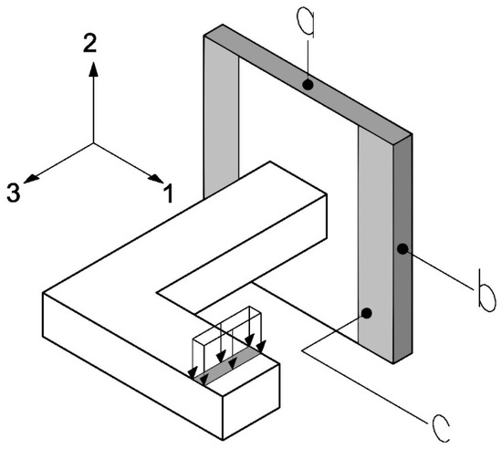 To validate this proposal, a design was selected considering manufacturing limitations, the feasibility of conducting the experimental test, and the existence of several relevant deformation states to obtain the elastic constants when the experimental test is performed. In this way, an L-shaped beam was selected, which was used by Domingo-Espín and his collaborators [53] to perform a result validation test, as shown in Figure 6. It is important to clarify that the L-shaped beam used in this study is not intended to replicate the geometry of a real bone scaffold, but rather serves as a simplified mechanical benchmark. Its geometry induces coupled bending and torsional responses, which are sensitive to variations in elastic constants. This allows for an evaluation of the methodology under controlled conditions.
