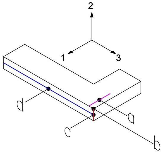 The surface a and its opposite are subjected to the no displacement condition in the direction 2, the surface b and its opposite are subjected to the no displacement condition in direction 1, and the surface c is subjected to the no displacement condition in the direction 3. Additionally, the area (near the cantilever) where a displacement of 3 mm in the negative direction of axis 2 is applied is highlighted. The conditions a, b, and c will be maintained throughout all tests, while the displacement conditions in the area near the cantilever may change depending on the elastic constant to be determined.
