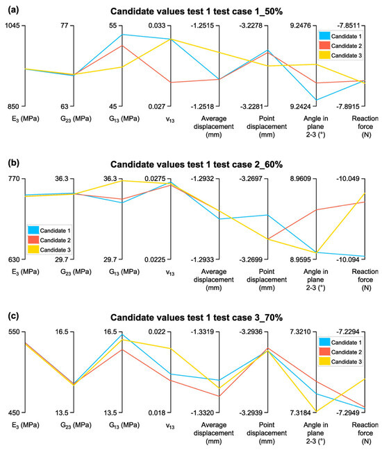 Once convergence is achieved, MOGA delivers three candidate solutions. Candidate 1 is generally prioritized, provided it satisfies both sensitivity and range validation criteria. These validations confirm that: (a) the selected constraints meaningfully influence the optimization outcome; and (b) the estimated elastic constants lie within the central region of the predefined bounds, avoiding edge solutions that may lack physical consistency.