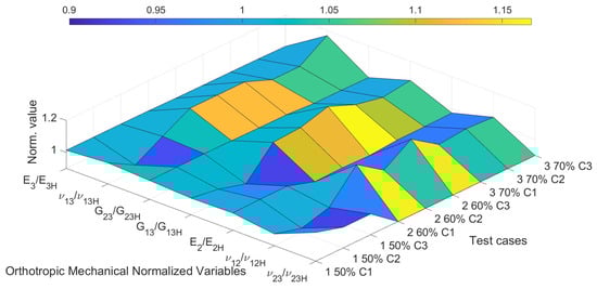 Figure 18 presents a three-dimensional surface plot that visualizes the normalized values of the orthotropic elastic constants estimated by the optimization algorithm (MOGA), in relation to their respective reference values obtained through homogenization. Each point on the surface corresponds to a normalized ratio of the form X/XH, where X denotes one of the seven mechanical parameters of interest, , and XH represents its homogenized reference value.