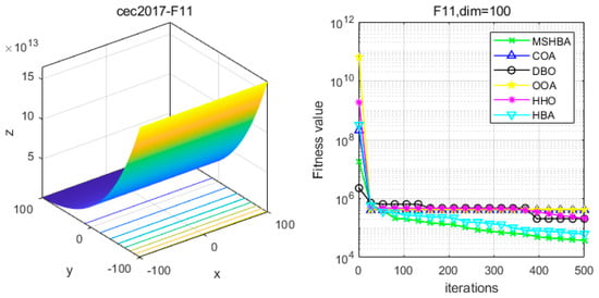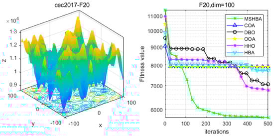 From Table 5, it can be seen that the MSHBA algorithm exhibits superior performance min, worst, median, average, and std on the hybrid function set F11–F20 compared to other algorithms such as Raccoon Optimization Algorithm (COA), Beetle Optimization Algorithm (DBO), Harris Hawk Optimization (HHO), Ospry Optimization Algorithm (OOA), Honey Badger Algorithm (HBA).