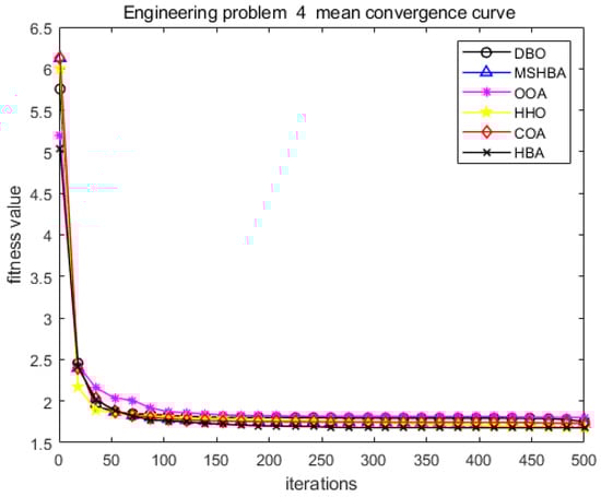 Table 4 shows that the MSHBA algorithm outperforms the Raccoon Optimization Algorithm (COA), Dung Beetle Optimization (DBO), Harris Hawk Optimization (HHO), Osprey Optimization Algorithm (OOA), and the original Honey Badger Algorithm (HBA) when tested on a set of multimodal functions (F4–F10), in terms of minimum, worst-case, median, average, and standard deviation (std) values.