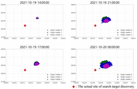 This section describes the problem setting and the input data. Although not addressed in our study, SAR planning requires the prior step of determining the location of the search target. To identify the location, the search target is represented as drift particles, which are placed at the accident site, and their drift trajectories are predicted. Recent studies employ various artificial intelligence models for predicting drift trajectories [16,17,18]. Nevertheless, due to the inherent complexity of marine environments, accurately predicting the drift trajectories of drift particles is very challenging, even with artificial intelligence. Therefore, modern SAR planning places multiple drift particles (approximately 1000–4000) on the initial drift locations near the accident site and predicts the drift trajectories of each drift particle. Even when drift particles are placed at the same location, their drift trajectories differ due to the seed value of the artificial intelligence model or slight differences in initial positions Figure 1). Among these widely dispersed drift particles, it is assumed that the actual search target exists at one of their positions. Hence, the objective of the search planning phase is to maximize the probability of success by including as many drift particles as possible.