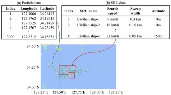 Accordingly, we use two inputs: (1) a map indicating the drift particle (search targets) positions (Particle data), and (2) information on SRU search capabilities and search times (SRU data). This forms the basic experimental environment. An example of the input data is shown in Figure 2. Figure 2a represents the drift particle position map, where the latitude and longitude of drift particles are provided. These positions are projected onto a two-dimensional plane using the Mercator projection [20]. Figure 2b shows SRU information and search times. The required SRU information includes the name, search speed, detection range, search altitude, and search time. The reason for including search altitude is explained in Section 2.2.