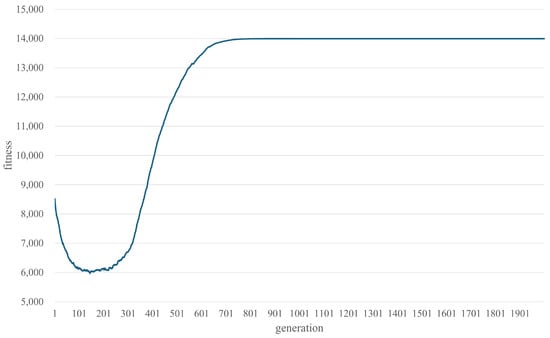 Figure 3 shows the convergence behavior for the best-performing configuration using the stress-test dataset (Case 1, Scenario 3, coverage ratio 1.0; details in Section 3.1). Each point represents the average fitness of the population in that generation. The convergence curve indicates that the algorithm stabilizes at approximately generation 1000. Based on this analysis, we adopt the following parameters for all subsequent experiments: 1000 generations, population size 700, 70 offspring per generation, and 30% mutation rate.