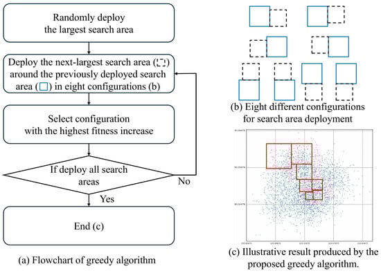 Greedy algorithm for search area deployment: (a) flowchart, (b) eight deployment configurations, and (c) illustrative deployment result (deployed search area (□)).