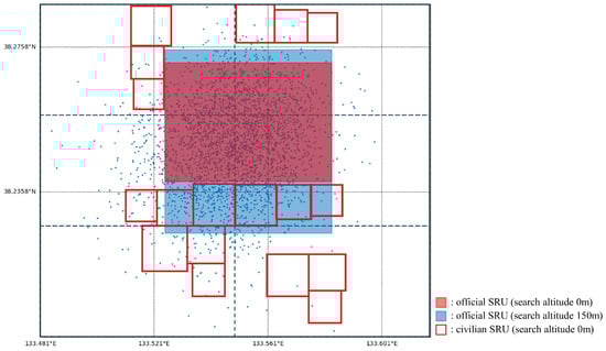 For example, if an official SRU is searching at an altitude of 0 m, deploying a civilian-SRU search area on top of it results in a significant fitness penalty due to collision risk. Consequently, EAGD and GA tend to avoid deploying search areas of civilian SRUs in overlapping positions. Conversely, if the official SRUs are operating at a higher altitude (e.g., 150 m), some degree of overlap may be acceptable. In such cases, the algorithm may allow minor overlaps to increase the overall fitness, accounting for the adjusted POD and p-fail values. This behavior is illustrated in Figure 5. In this figure, light red and light blue search areas represent preassigned official SRUs: the light red indicates units operating at 0 m altitude, and the light blue represents units at 150 m altitude. The dashed lines show the six subregions defined by EAGD. Dark red search areas correspond to the search areas assigned to civilian SRUs by EAGD.