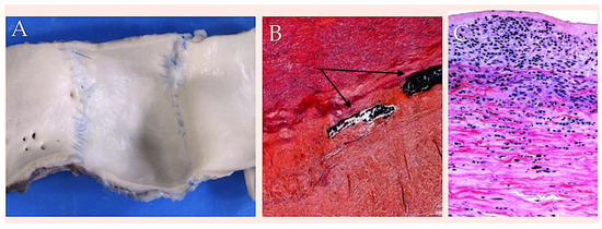 Figure 2. The following image presents a macroscopic and microscopic view of a reinforced explanted pulmonary autograft at six months post-surgery. The graft has been reinforced with a biodegradable mesh. (A) The tunica intima has undergone no disruption and is otherwise free from abnormality; (B) The tunica media displays normal thickness and is devoid of any disruption. The presence of PDS remnants is indicated here by the black arrow. (C) The tunica intima exhibits intimal hyperplasia. Abbreviations; PDS, polydioxanone.