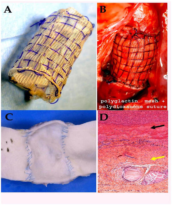 Figure 5. The accompanying illustration delineates the utilisation of absorbable materials, which are employed for the purpose of either mesh or stitching. (A) A composite scaffold is constituted for the purpose of external reinforcement. (B) The composite scaffold, composed of polyglactin 910 mesh and polydioxanone suture, serves as an external reinforcing structure that mimics the biological properties of the suture. (C) At the six-month stage, the tunica intima of the vessel wall exhibited an intact structure, devoid of any disruption or inflammatory response. (D) The pathological examination revealed no abnormalities in thickness, with the tunica media (yellow arrow) and tunica intima (black arrow) exhibiting no signs of disruption.