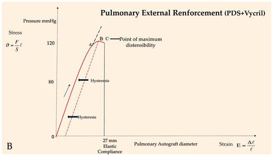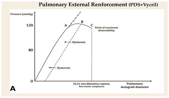 Figure 6. The model under consideration is a simple mathematical one, with the relevant curves being fitted based on the neo-Hookean hyperelastic behaviour of the vessel. (A) In the absence of reinforcement. The graph illustrates this point. A = term denoting the elastic behaviour; B = non-elastic behaviour; C = maximum distensibility. (B) The product incorporates a resorbable reinforcement element. PDS, in conjunction with Vycril, is utilised as a constituent of a crosslinked bioresorbable external reinforcement. This combination has the capacity to modify the behaviour of distensible materials in terms of their curvature. The promotion of elastic remodelling by PDS plus Vycril has been demonstrated to influence the elastic region of the graph. This has been shown to result in a shift in points A, B, and C, which in turn has led to a reduction in the critical area determined by the fall of the curve. Abbreviation; PDS, polydioxanone.