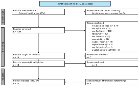 PubMed/MEDLINE was first manually queried without non-English language restriction from inception until 17 June 2025, using search terms related to metal composite bone grafts in animal models of spinal fusion. Search terms used were as follows: (“bone graft*”[tiab] OR “bone scaffold”[tiab] OR “graft”[tiab]) AND (“Spine”[mh] OR “spine”[tiab] OR “spinal”[tiab] OR “Spinal Cord”[Mesh] OR “spinal cord”[tiab] OR “lumbar”[tiab] OR “cervical”[tiab] OR “thoracic”[tiab] OR “sacral”[tiab] OR “Spinal Cord Compression”[Mesh] OR “Osteoarthritis, Spine”[Mesh] OR “Spinal Stenosis”[Mesh] OR “spinal stenosis”[tiab] OR “spine surgery”[tiab] OR “spinal surgery”[tiab] OR “Spinal Fusion”[Mesh] OR “spine fusion”[tiab] OR “spondylodesis”[tiab] OR “Laminectomy”[Mesh] OR “laminectomy”[tiab] OR “hemilaminectomy”[tiab] OR “Laminoplasty”[Mesh] OR “laminoplasty”[tiab] OR “foraminotomy”[tiab] OR “spine decompression”[tiab] OR “spinal decompression”[tiab] OR “spine arthrodesis”[tiab] OR “spinal arthrodesis”[tiab] OR “interbody fusion”[tiab]) AND (“metal*”[tiab] OR “Metals, Heavy”[Mesh] OR “Metals”[Mesh] OR “steel”[tiab] OR “magnesium”[tiab] OR “titanium”[tiab] OR “nickel”[tiab] OR “copper”[tiab] OR “cobalt”[tiab] OR “chromium”[tiab] OR “strontium”[tiab] OR “zirconium”[tiab] OR “tantalum”[tiab] OR “gold”[tiab] OR “silver”[tiab] OR “iron”[tiab] OR “platinum”[tiab] OR “zinc”[tiab] OR “lithium”[tiab] OR “manganese”[tiab] OR “silicon”[tiab] OR “silicon”[tiab]).