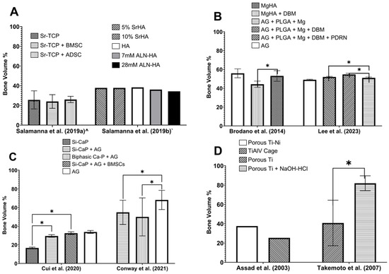 Bone Volume Percentages (BV%s) of Fusion Masses. Mean and standard deviation BV%s are plotted for eight included studies. (A) BV%s for studies investigating strontium-composite bone grafts [29,30]. (B) BV%s for studies investigating magnesium-composite bone grafts [28,35]. (C) BV%s for studies investigating silicon-composite bone grafts [33,34]. (D) BV%s for studies investigating titanium-composite bone grafts [22,26]. ‘*’ denotes p < 0.05 for intra-study comparisons.
