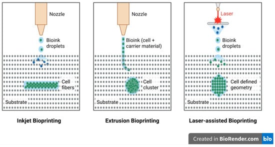 Inkjet bioprinting, one of the earliest approaches used for the deposition of live cells, was initially explored by modifying commercially available inkjet printers [7]. Early challenges in this technique included significant cell death due to rapid drying once deposited onto the substrate. This was later addressed by encapsulating the cells within highly hydrated polymers, giving rise to the development of cell-laden hydrogels that maintained cellular viability [13]. Inkjet bioprinting operates by ejecting droplets of bioink, comprising cells and biomaterials, through either thermal or piezoelectric mechanisms to precisely pattern them into desired geometries [14,15].