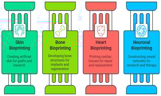 In the neural domain, Tse et al. have used piezoelectric bioprinting to deposit porcine Schwann cells and NG108-15 neuronal cells, reporting immediate post-printing viability rates of 86% and 90%, respectively, along with neurite extension over seven days [20]. Cardiac tissues engineered using alginate hydrogels and feline cardiomyocytes displayed contractility upon mild electrical stimulation, highlighting functional integration. Furthermore, full-thickness skin models with freckle-like pigmentation were produced in a study through the layered deposition of fibroblasts, keratinocytes, and melanocytes, resulting in successful dermal–epidermal stratification [5,15].