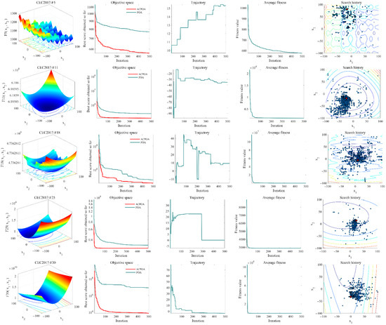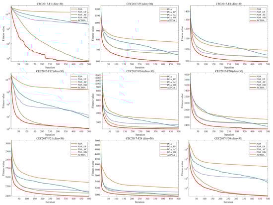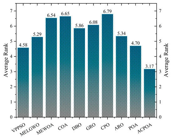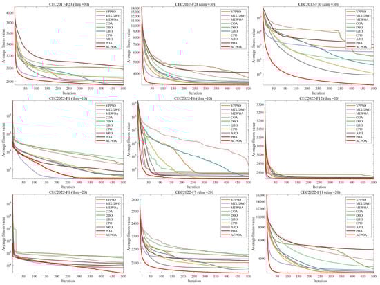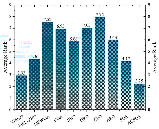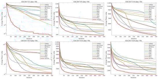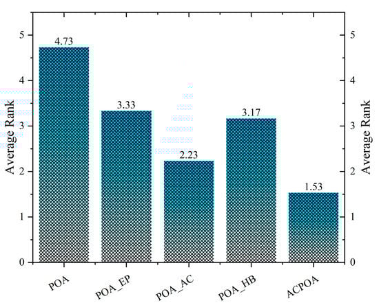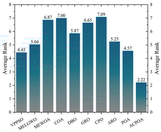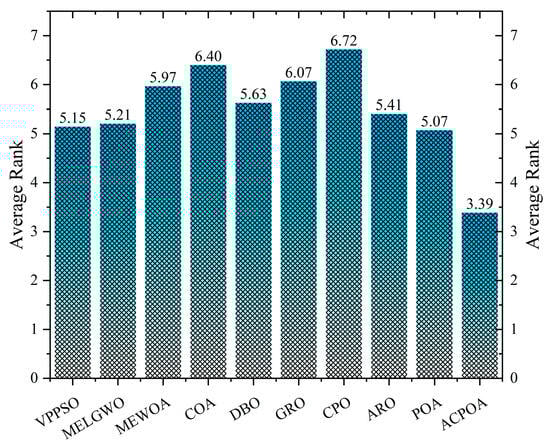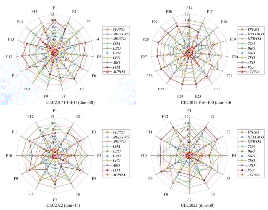 - Validation of optimization performance: The performance of ACPOA is evaluated on the CEC2017 and CEC2022 benchmark test suite, in comparison with eight state-of-the-art algorithms (such as Particle Swarm Optimization (PSO), Grey Wolf Optimizer (GWO), Whale Optimization Algorithm (WOA), etc.). Statistical indicators including mean, standard deviation, and ranking are used to comprehensively demonstrate the superiority of ACPOA in solving optimization problems of various dimensions and function types, particularly in terms of convergence speed, solution accuracy, and stability;