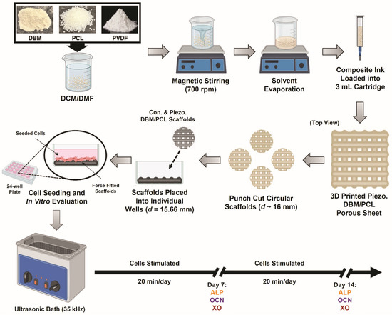 −1, Sigma-Aldrich, St. Louis, MO, USA) were dissolved in dichloromethane (DCM, VWR, Radnor, PA, USA) and PVDF powder (Sigma-Aldrich) was dissolved in N,N-Dimethylformamide (DMF, Fisher Scientific, Waltham, MA, USA) to produce two separate 10 wt% polymer solutions. The PCL and PVDF solutions were then combined and subjected to continuous stirring (700 rpm, at ~50 °C), resulting in a single homogenous polymer solution. Once cooled to room temperature (RT), DBM powder (<125 µm) was added, and the dual polymer mixture was vigorously stirred to form a composite ink. For this report, inks consisting of only PCL or a 50:50 wt% ratio of DBM/PCL were created and used for scaffold fabrication.