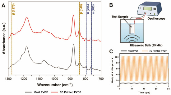 Fourier-transform infrared (FTIR) spectroscopy was performed on printed PVDF and cast PVDF films using a Nicolet 6700 FTIR spectrometer (Thermo Fisher Scientific, Waltham, MA, USA) to assess whether this fabrication method was suitable in producing a high β-phase content in PVDF (i.e., capable of producing piezoelectric scaffolds). The characteristic absorbance peaks of the α-phase at 763 cm