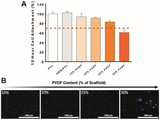 23]. We assessed the hydrophilicity of our developed composites (based on their PVDF content) using a 12 h cell attachment study. Scaffolds with varying concentrations of PCL and PVDF (DBM content was consistent at 50%) were prepared and pre-wetted ON in growth medium to slightly encourage cellular attachment while allowing the negative effects of excessive PVDF content to be displayed. After a 12 h incubation period, the relative attachment (compared to PCL-only scaffolds) was measured using a CCK-8 assay (