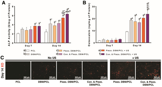 33]. Our work combines the use of low frequency ultrasound, conductive/piezoelectric biomaterials, and ES to produce a synergistic regenerative effect. The influence of our biomimetic dual-sensing scaffolds combined with US on osteogenic differentiation of hMSCs was investigated after 14 days and compared to cells grown on various scaffolding constructs (with and without US) using both quantitative and qualitative techniques. US consisted of 20 min of 35 kHz stimulation every day for up to 14 days. Cells grown on conductive piezoelectric scaffolds and exposed to US had significantly higher expressions of ALP (